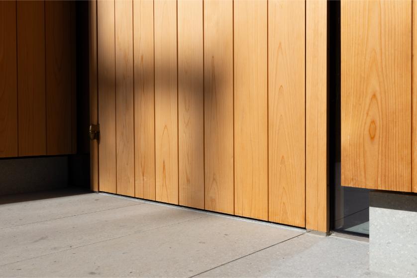3つある玄関ドアは「スチール製」「木製片開き」「木製上吊り引き戸」と法的条件や使い勝手によって分けられた仕様ながらも、統一された樹種とデザインで一つの建物にうまく調和しています。