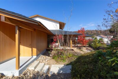 緩やかな勾配屋根と深い軒が、周囲の風景に静かに溶け込む住まい。